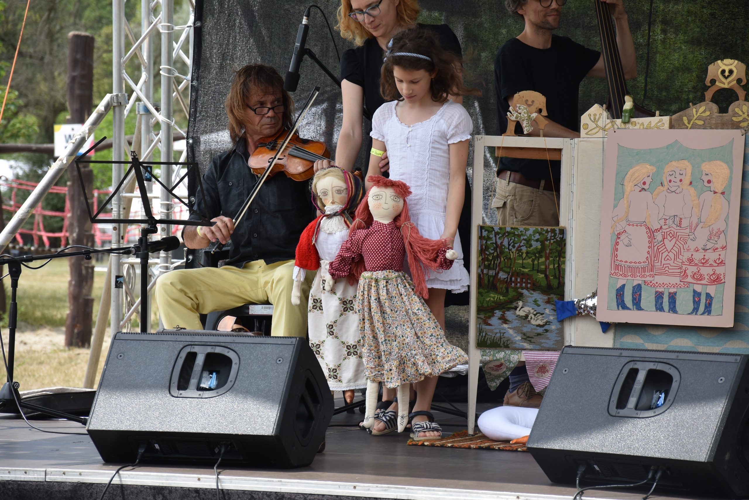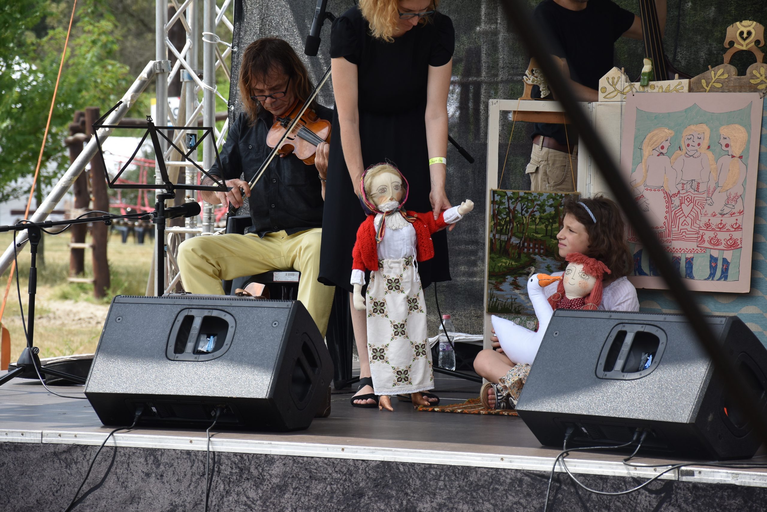 Több mint 10 éves munkakapcsolat, és mély barátság köt össze Danyi Zsuzsival, akire méltán ragadt rá a „mesemondó” cím, nemcsak a televízós, a Szimfonikus Zenekari, de az egyéb színpadi megjelenések közönségétől is. A hosszú idő alatt számtalan alkalommal egészítettük ki egymás munkáját, mindannyiszor sikert és szeretetet nyerve a bennünket hallgatóktól. Hamarosan hangszeres játékkal is bővültek előadásaink. 2019-ben aztán a harmadik társunk Hodos Szilvi népzenész távozása után, új társra találtunk. Lakai Zoli fő profilja a gitárjáték, de mindenen is játszik. Vele folytattuk előadásainkat, élőszóval mondott mesével, énekkel, hangszeres játékkal és homokanimációval. Idén pedig Dénes is csatlakozott hozzánk a szép nagybőgő társaságában. Mivel az életben csak a változás örök, így egy alkalom azt az igényt hozta, hogy másféle módon illusztráljam a bemutatott történetet. Ekkor születtek kirázólag kézzel készült nagyméretű bábjaink. Legutolsó fellépésünkön a Palacsintafesztiválon már velük együtt szőttük egybe meséink szálait.